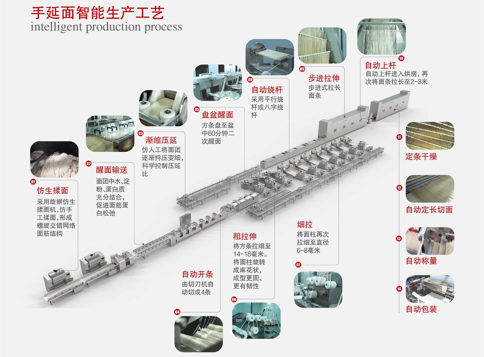 海科佳全自動手延面生產線是自主研發制造的創新產品,整線工藝還原傳統手工制面工藝,通過和面醒發、漸縮壓延、切條盤盆、細拉上桿、步進提升、烘干切斷等工序,實現傳統手工拉伸工藝,為企業滿足食品安全、高端產品轉型提供智能化服務。產能可實現10-20噸/天的產能,目前是產能最大的手延面生產線。